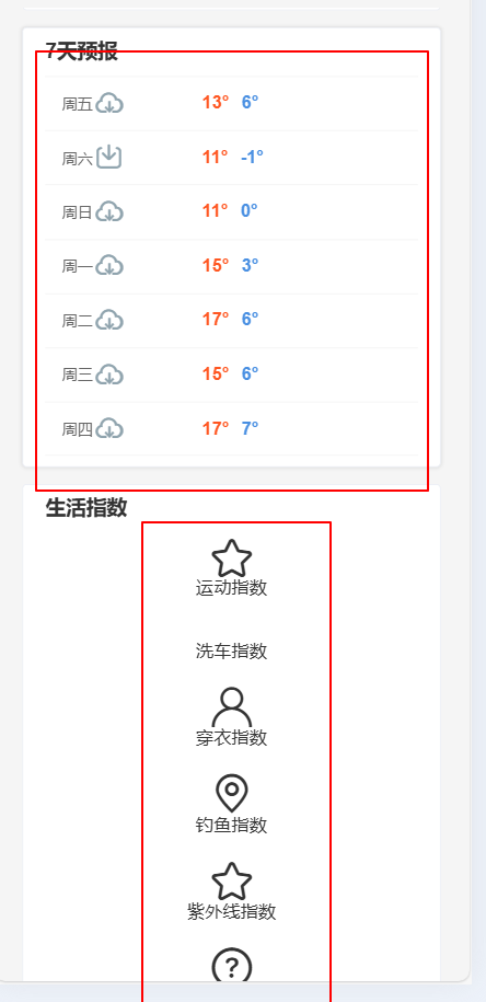 1. 完善 /utils/api.js内容(参考 getCurrentWeathergetAirQuality,完善 get7dForecastgetLifeIndex函数,获取 7 天天气预报和生活指数),具体流程参考 api.js 内的函数注释。